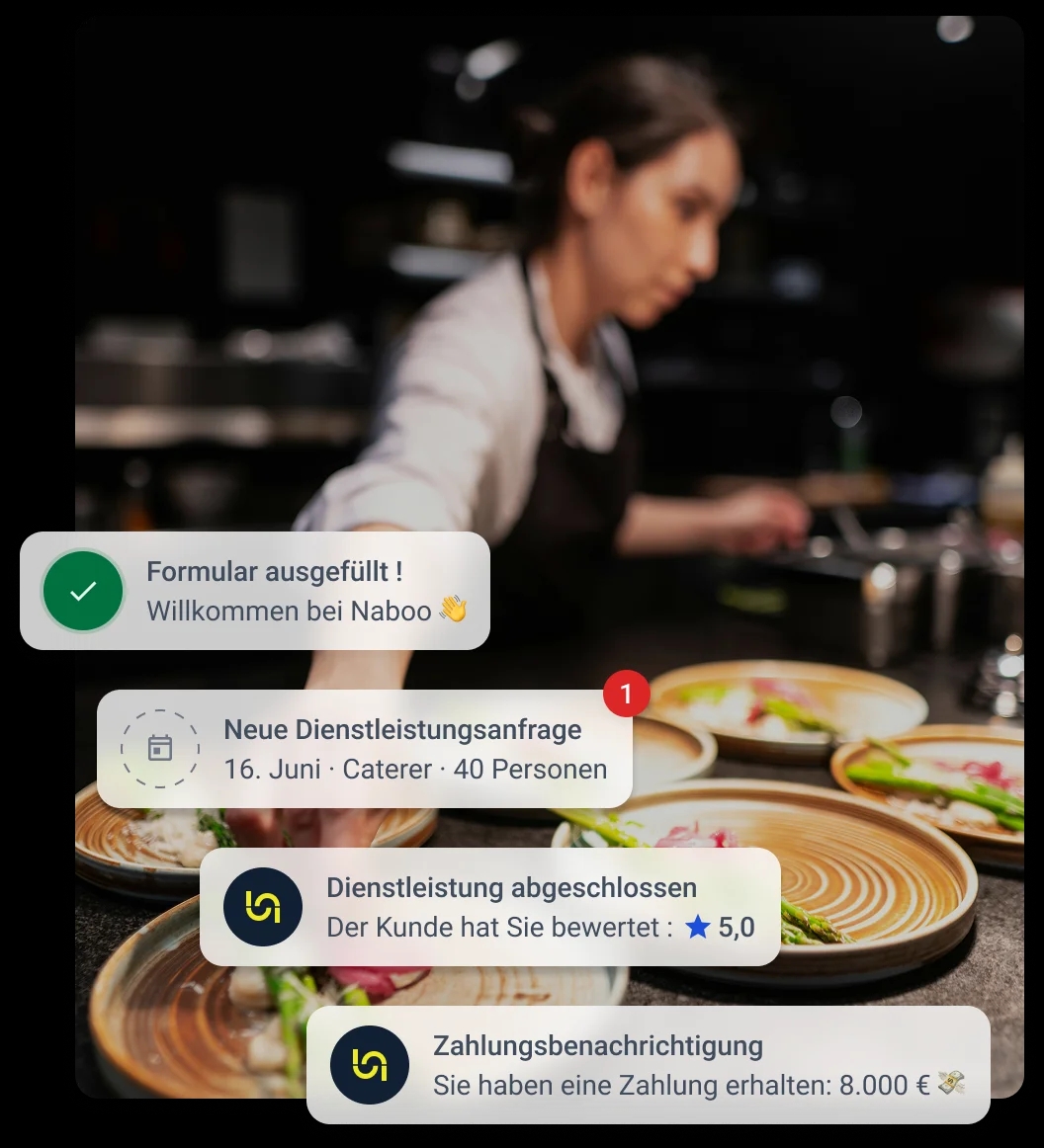 Sie sind ein Fachmann im Eventbereich und möchten Ihr Geschäft ausbauen? Treten Sie Naboo bei und werden Sie für über 5000 Kundenunternehmen in ganz Europa sichtbar!